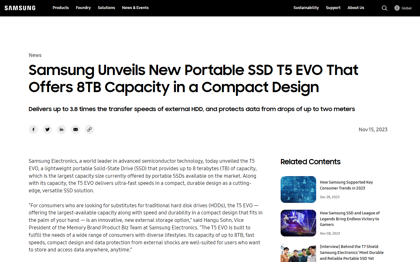 Samsung Electronics releases an external SSD T5 EVO that holds a maximum storage of up to 8TB
