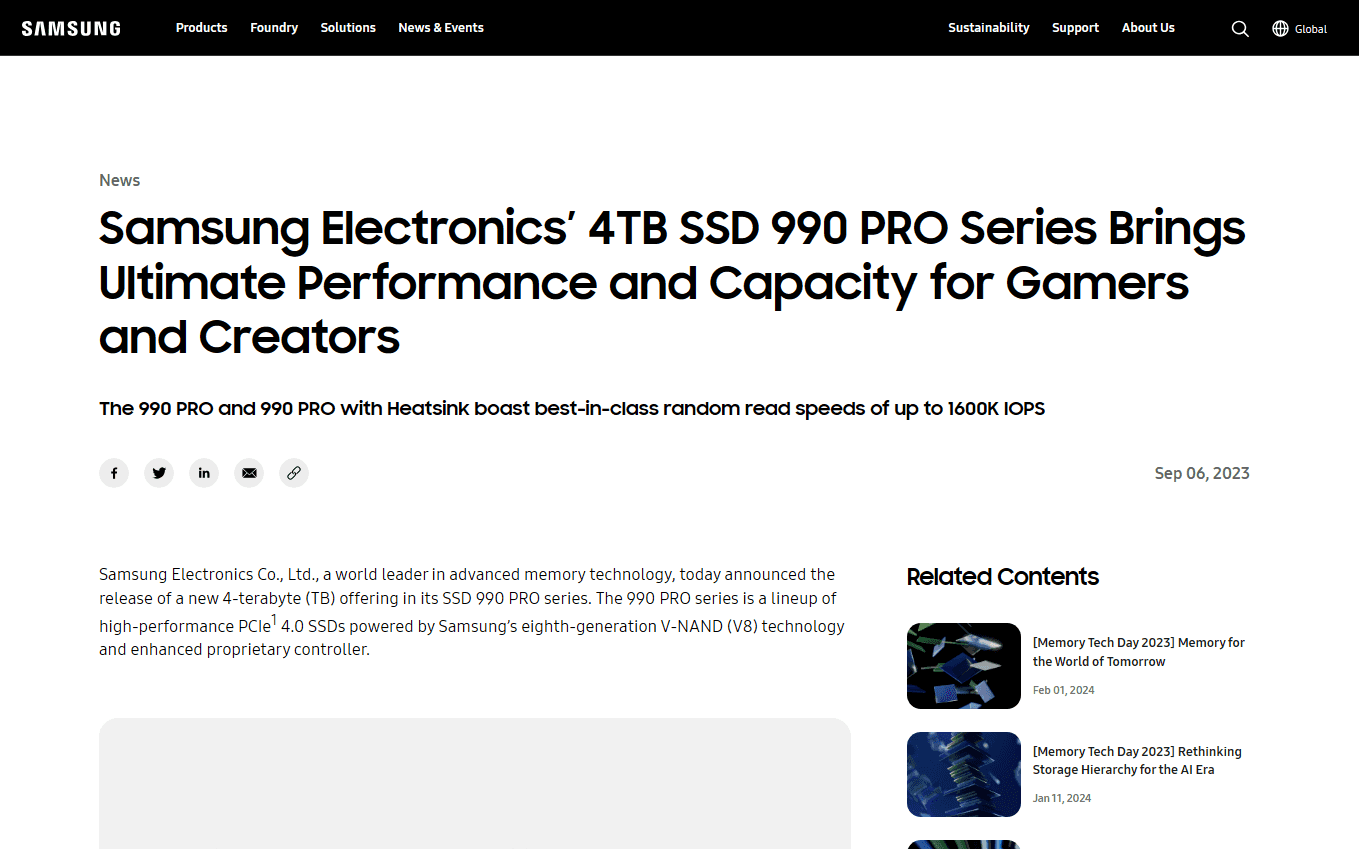 Samsung Electronics releases the expanded version of the SSD 990 PRO Series, with new capacity size of up to 4TB.