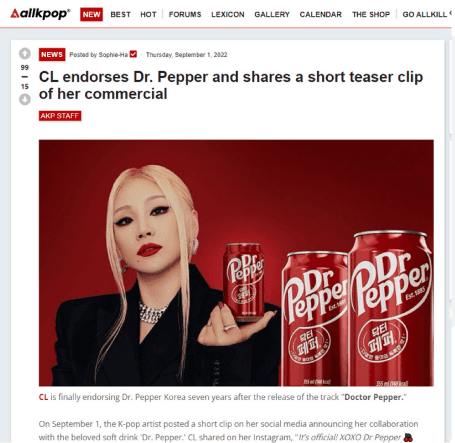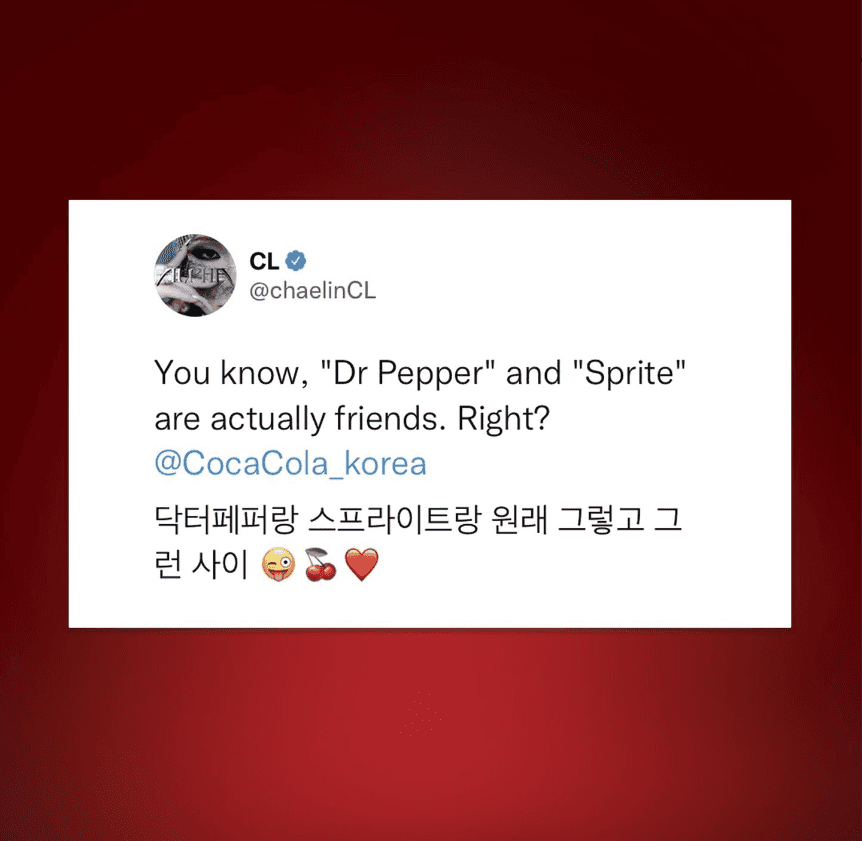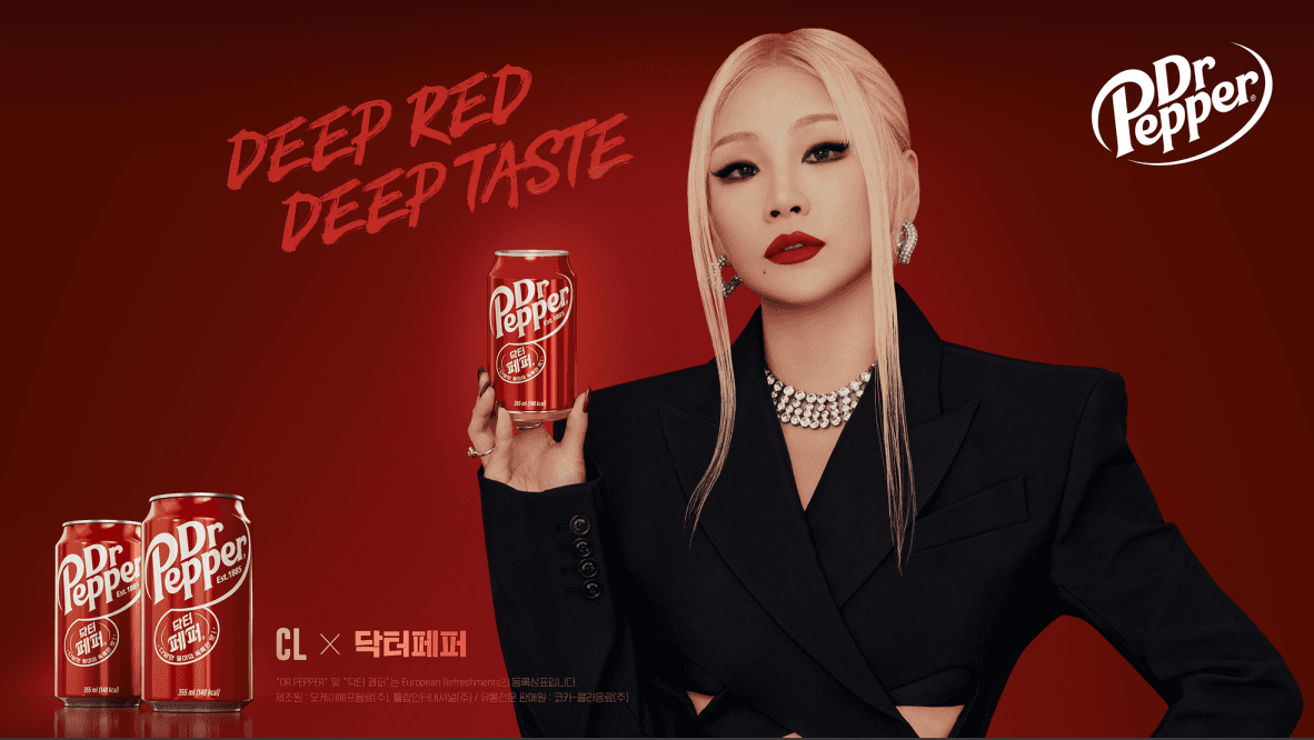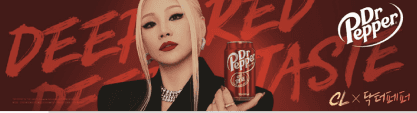 Dr. Pepper's iconic dark red color and unique strong flavors compliments CL's style of bold, strong, and beauty in red. CL's chic expression of confidence and bold style as an international hip-hop artist with her own company of "Very Cherry" holds true to Dr. Peppers unique taste.